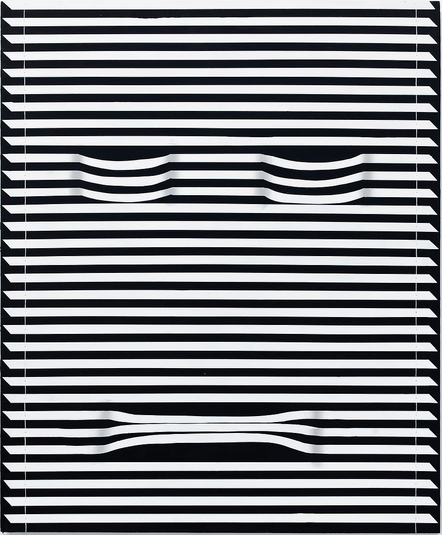 The human face is perhaps the only object that has resisted Tyberghein’s efforts to find a symbolic essence. She often returns to it, but always by combining separate elements rather than creating a unified symbol: Eager Edith (2019), for example, makes a face by arranging pencils and pencil stubs on a plain background, while Hide Away (2019) forms eyes and a mouth by bending the horizontal white lines of a venetian blind.
