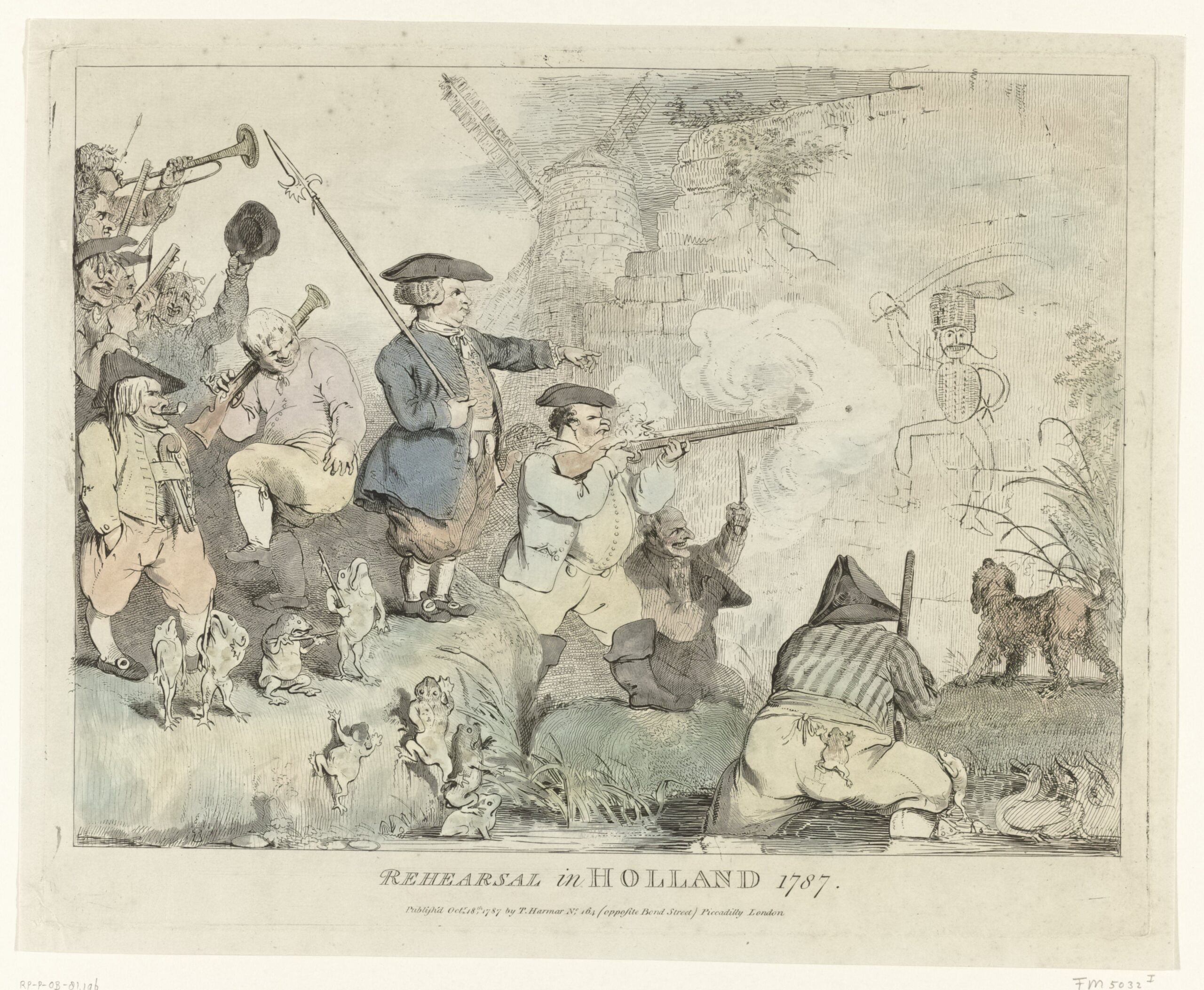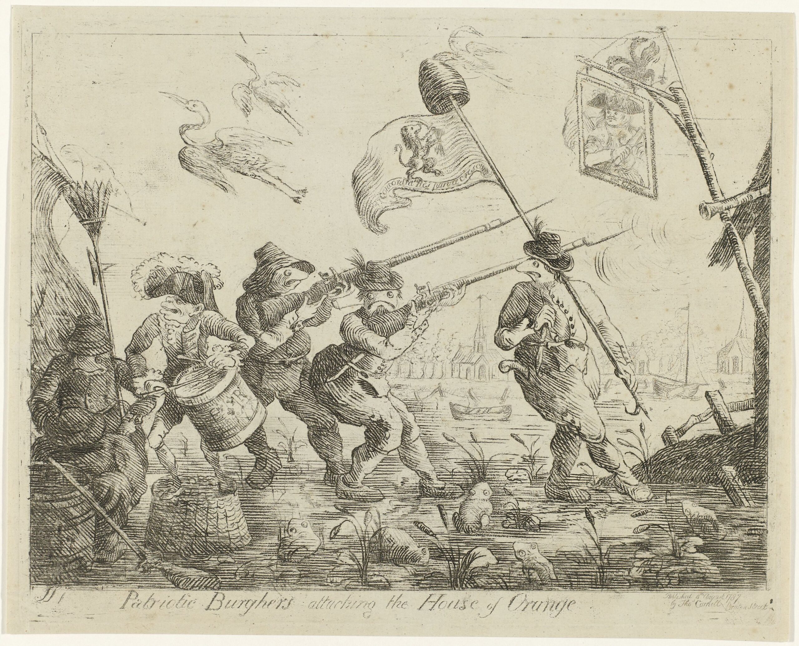 The frog leads a persistent existence in the history of the allegorical cartoon. During the revolutionary turmoil at the end of the eighteenth century, for example, it returns in huge numbers as the embodiment of the rebellious patriots who turned against stadtholder William V and the feudal House of Orange-Nassau. Its role does not tend to be a positive one. In a wonderful British print by James Sayers, Patriotic Burghers attacking the House of Orange (1787), the frog soldiers are depicted as clumsy, farcical, fearful figures, with their French-inspired attack doomed to failure.