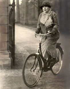 Queen Wilhelmina on her bikeIn 1897 Queen Wilhelmina, then still a minor, saw a bicycle for the first time. She very much wanted to ride it, but the government forbade it because the risk of infertility must be avoided at all times. A year later when she succeeded to the throne, she overturned the prohibition, but promised her government that she would not appear in public on a bicycle. Thirty years later the queen was recorded by a patient photographer on her bike. The photo went around the world and established the reputation of the Netherlands as a cycling nation. In 1935 when her daughter Princess Juliana presented her fiancée Bernhard on a tandem – she in front, he behind – the image was once again reinforced. For the current generation of princesses cycling is as normal as for any other child.