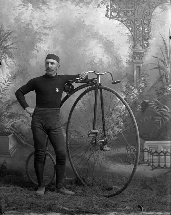 A man with a handlebar mustache poses with his penny-farthing, ca. 1890New inventions fifty years later enabled the onward development of the bicycle. French blacksmiths attached pedals to the front wheel. French and English bicycle makers subsequently developed a lighter and stronger structure for the wheels. The era of the penny-farthing