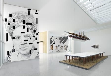 Iris Kensmil (b. 1970) depicts in her work an inclusive history from a Black feminist perspective. She honours Black authors, philosophers, activists and musicians, and, in general, the Black counter-movement that is an undeniable part of modernity. She connects the utopian thinking of modernism with Black female intellectuals whose work offers its own perspective on modernity and the future.