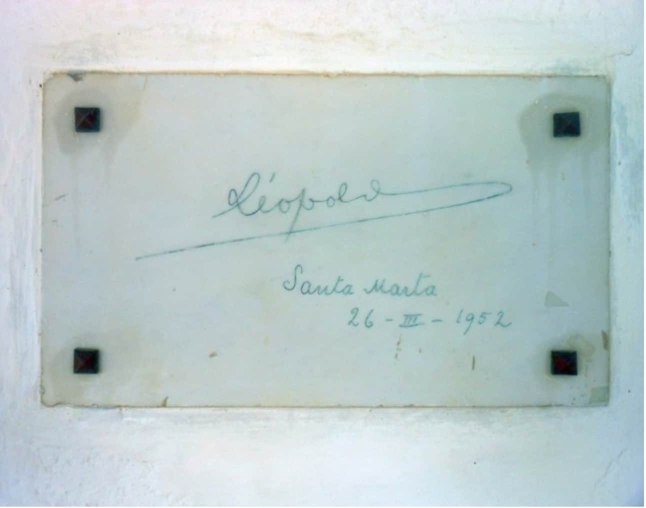 If it’s true that every human life is littered with shreds of chance, I certainly got more than my fair share here. As I looked, becoming less and less interested in a motley collection of memorial plaques in an arched gallery behind the Altar, my eye suddenly caught sight of something that seemed strangely familiar. Leopold had not only visited here on 26 March 1952 but had also had his presence immortalized! Why had I never read anything about that? Did people know about this? While I agree that Santa Marta is a distant, not very attractive corner of a country that had been cut off from the outside world for decades because of war and conflict, the forgotten existence of this stone still stunned me and suddenly seemed to reduce my surroundings to a kind of background noise.