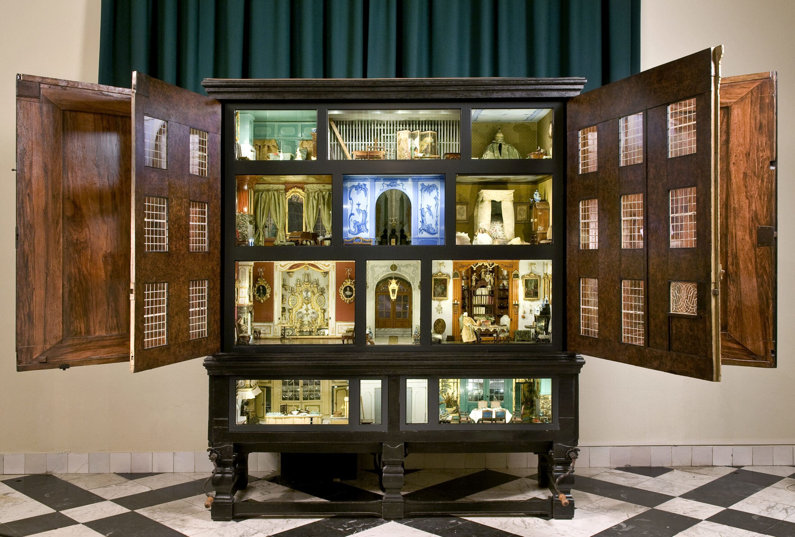 The Dollhouse of Sara Rothé at the Frans Hals Museum in Haarlem provides us with an intimate glimpse into the rich life of the eighteenth century. Behind the façade of this canal house, each of the twelve rooms is decorated and furnished according to the fashion of the time. The fact that the designer used several older dollhouses to construct this one should not detract from our admiration.