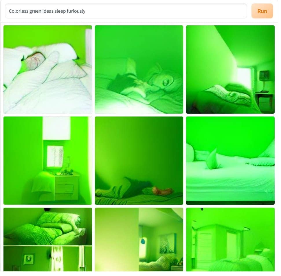 People have been trying to make sense of this ever since. There was even a real contest once. The goal was to write a poem in which the sentence above did have meaning. The entries are listed here: some of them are quite nice. Recently, the artificial neural network DALL-E