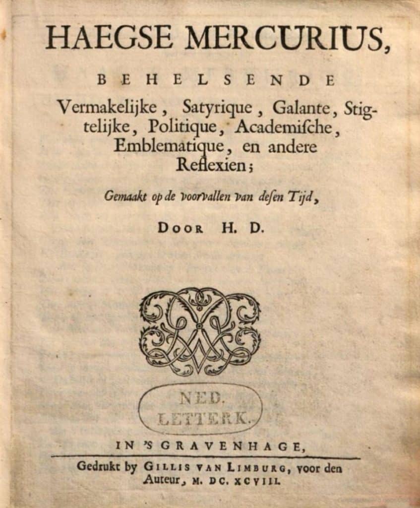 On 7 August 1697, the very first Dutch satirical magazine rolled off the press. It is not surprising that this happened in The Hague, which was already the political centre of the Netherlands at the time. Haegse Mercurius was the name of the magazine, and in the following two years it would appear no fewer than twice a week, every Wednesday and Saturday. In Roman mythology, Mercury was, among other things, the messenger of the gods, and thus a sort of newscaster or reporter. For this reason, his name often appears in the titles of seventeenth- and eighteenth-century newspapers. Haegse Mercurius