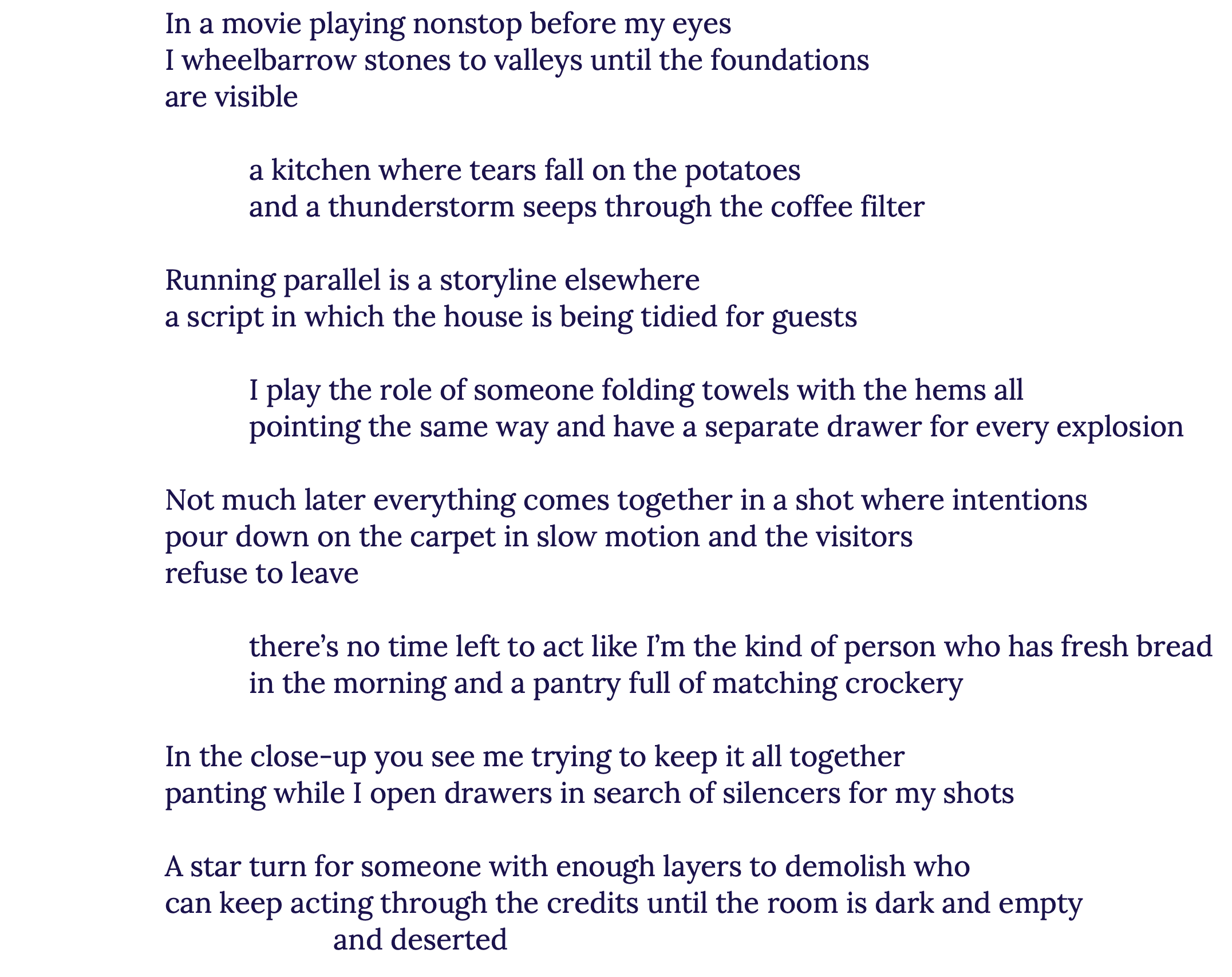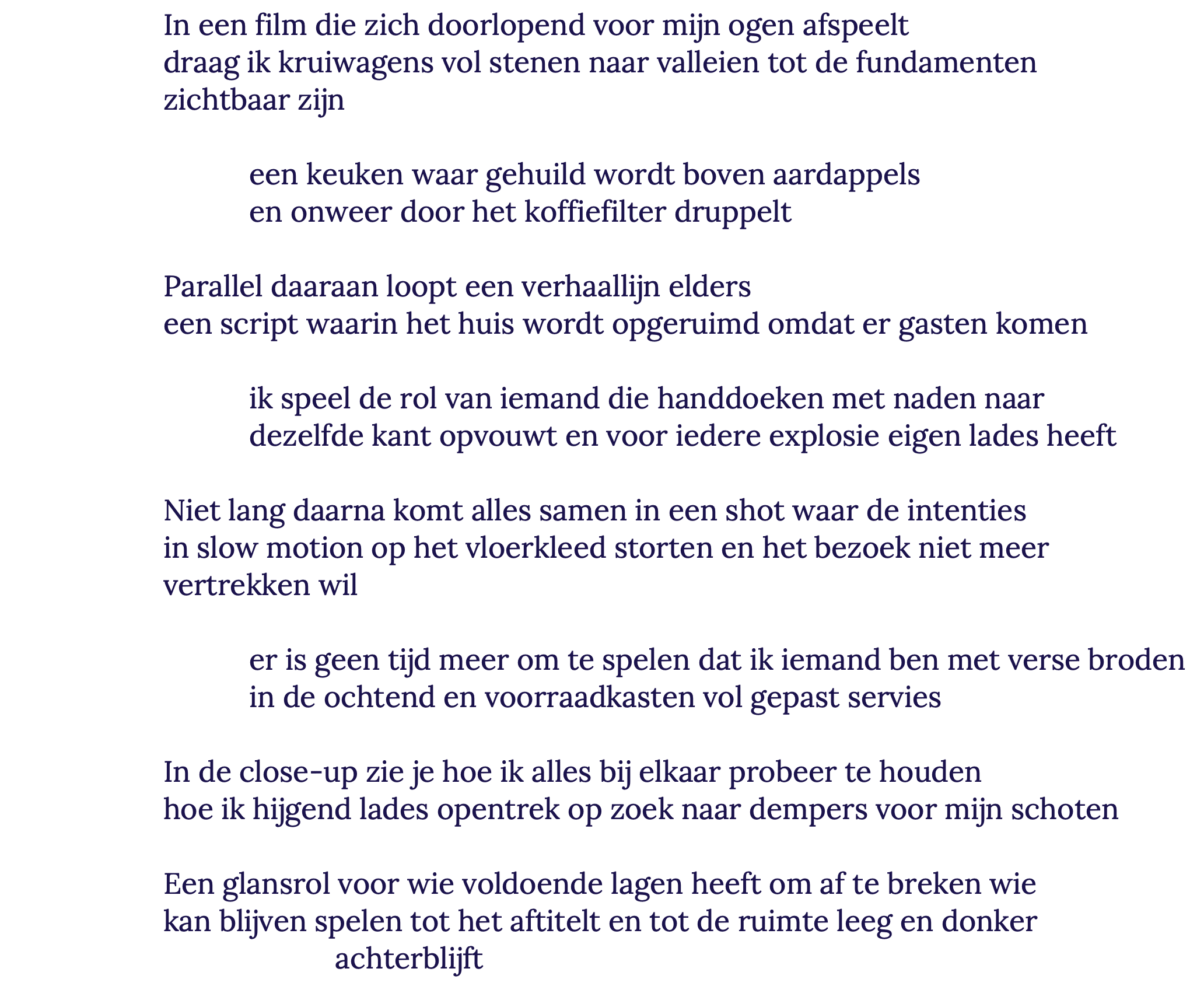 Willemijn van den Geest (Kinderdijk, b. 1988) is a poet and writer living in Nijmegen. Her work was published in, among others, Het Liegend Konijn, Deus ex Machina and Kluger Hans. She also regularly collaborates with jazz musicians under the name Klinkende Kosmos, in performances in which poetry and music enter into a dialogue.