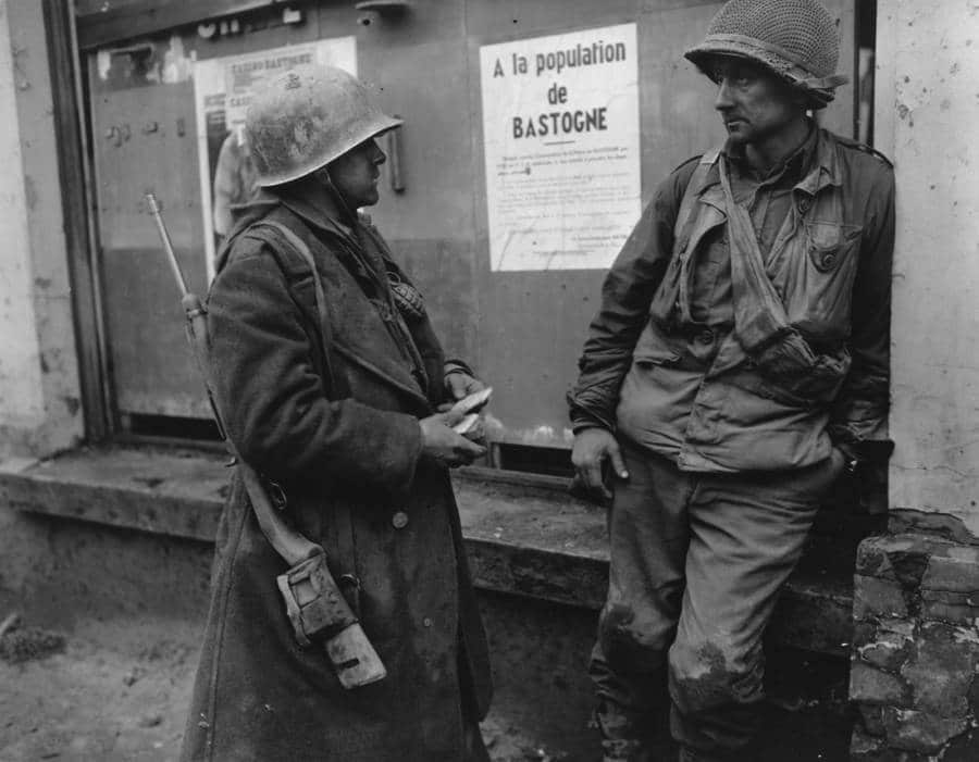 Two American soldiers on the streets of Bastogne, a city under siege by the Nazi army, 19 December 1944© National Archives