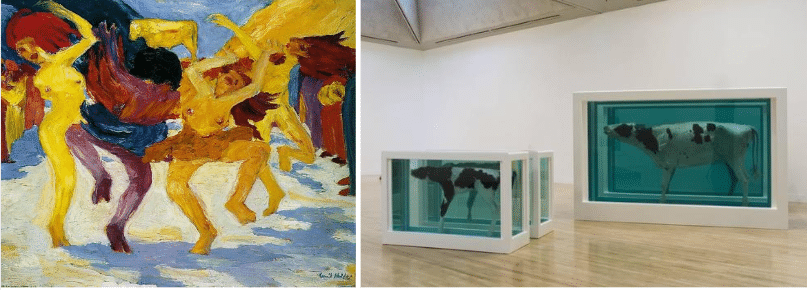 Emil Nolde, Dance Around the Golden Calf, 1910 / Damien Hirst, The Golden Calf, 2008© Wikimedia - Pinakothek der Moderne, München/ © Damien Hirst and Science Ltd. All rights reserved, DACS/Artimage 2020. Photo: Prudence Cuming Associates Ltd.
