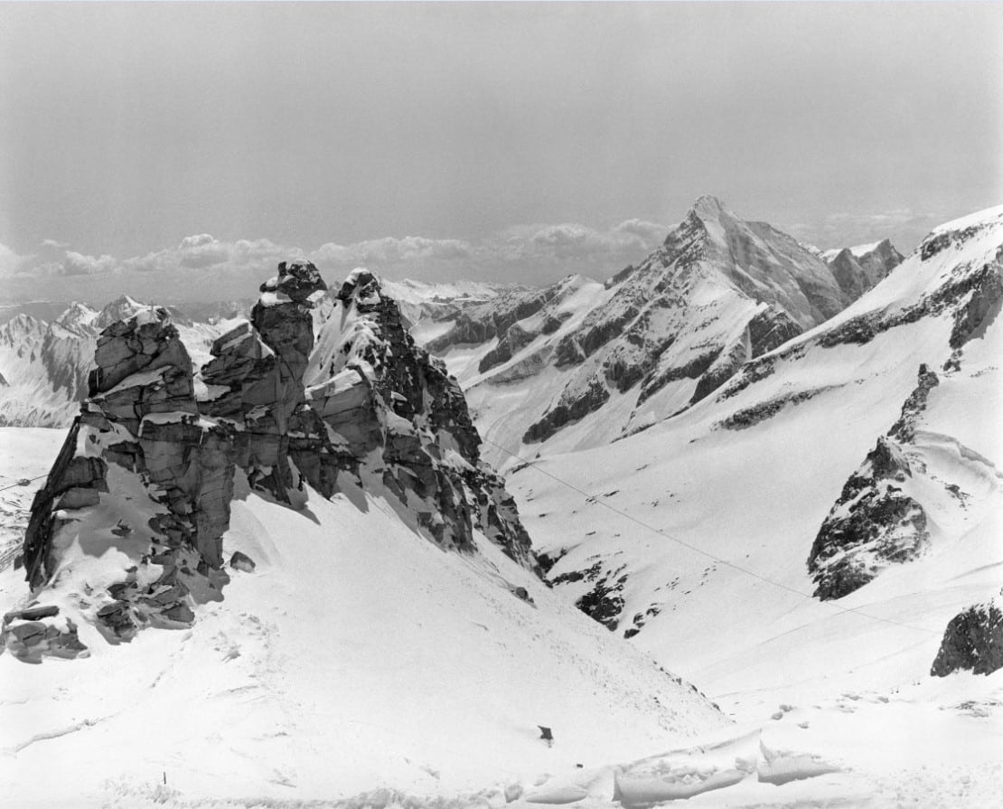 Afterwards, Van der Molen’s photography leads you further into the forest. Past the treeline, to the cubic, futuristic, breathlessly unfocused landscape of snow and mountaintops. Bar a cable there is no sign of human presence – the steal line runs through the image like a reverberating piece of notation.