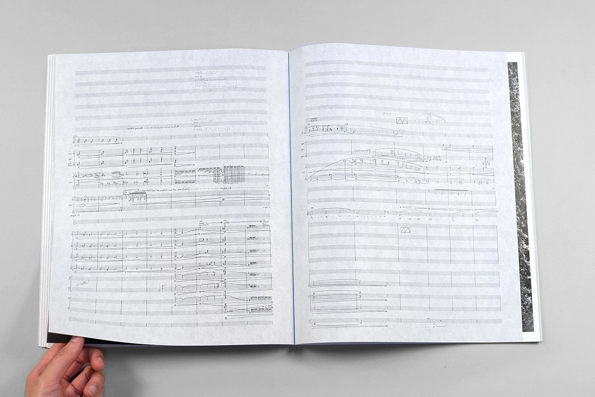 The mountain is the subject, but the trees are the characters in The Living Mountain. They even make an appearance in Larcher’s score, midway through the publication, creating an effect akin to a clearing in a forest, an open space where light can enter. The publication extends Van der Molen’s formalism onto wafer thin paper: one side black, the other side covered with the needle-sharp print of the score. Once printed, the music notation resembles a minimalist pine forest, the writing between the staff as directions for characters: ‘Let sticks bounce on the mallets (the arms moving up).’ You can see them sway, the branches. Yet to experience its sound, we have to wait a until the postponed world premiere in Amsterdam.