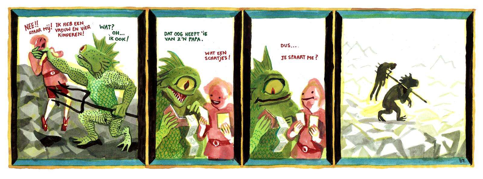 Evens created other, funnier creatures with Idulfania, the series he drew from 2009 to 2011 for Zazie, the youth supplement of the newspaper Brussel Deze Week (now BRUZZ). In Idulfania, he takes a good look at both fairy tales and medieval epics and serves up a wide range of gag strips that are reminiscent of Kamagurka and Jeroom in terms of absurdity and cynicism. The same sense of black humour is also used in the gag plates in Pieter De Poortere’s Dickie universe or Thijs Desmet’s graphic novel Smoking Kills (2018). The Idulfania strips were only finally collected in a wonderful oblong-format booklet in 2021. The two- to five-part series with doom scenarios and witticisms – all illustrated with Evens’ characteristic watercolours – really come into their own there.