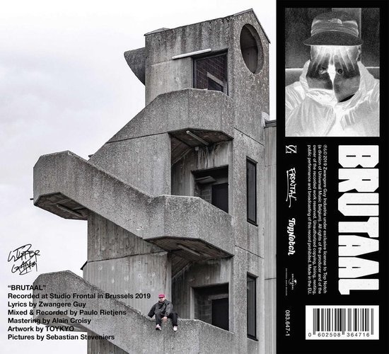 BRUTAAL, the second album of Zwangere GuyZwangere Guy repeatedly built up and demolished his self-image in Wie is Guy?, but with its successor BRUTAAL (2019), he seems to build up his own facade. In line with the hip-hop adage of keepin’ it real, this facade must remain honest and authentic at all costs. The album cover is a nod to Canadian rapper Drake’s cover art for Views, which he photographed atop the CN Tower in Toronto. Guy, on the other hand, was photographed atop a brutalist building at the Free University of Brussels. The composition is ironic: he himself only attended school until the age of fifteen, having climbed out of a gutter to get to where he is now.