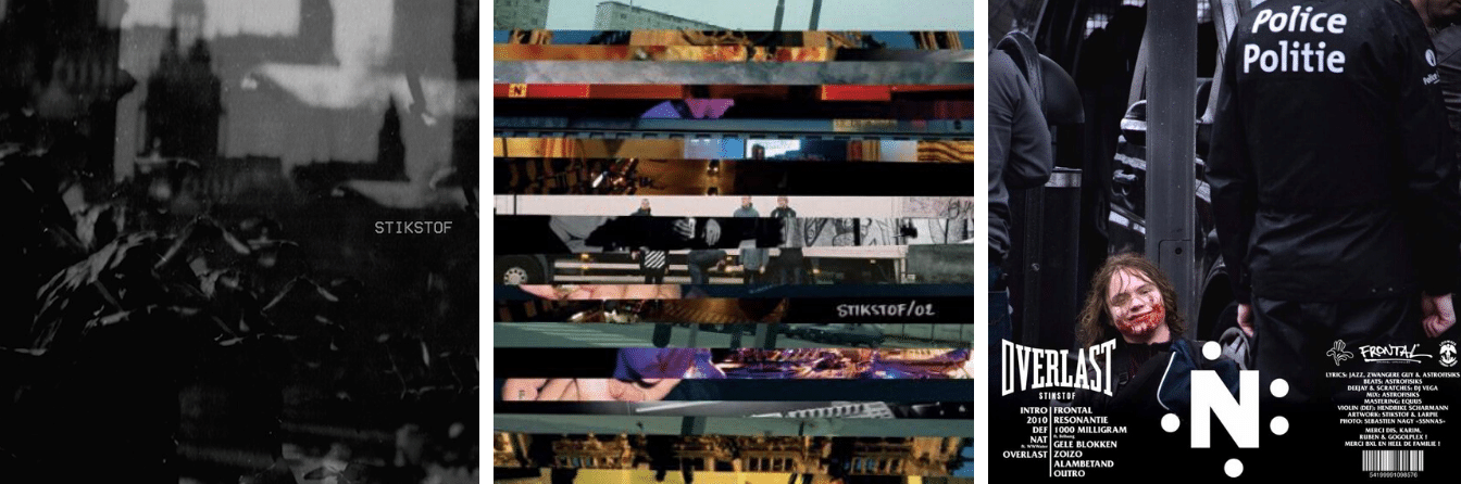 From left to right: STIKSTOF (2014), STIKSTOF/02 (2016) and OVERLAST (2018)The track Utopia opens with samples taken from Flemish and Wallonian news reports describing burning cars at the Halle Gate, condemning riots in Anderlecht, and branding the Molenbeek neighborhood as a ghetto. The track itself can be interpreted as a response to the negative representation of the city in the news, which is all too often one-sided. In contrast, it is a sizzling ode to Brussels in which the rappers present themselves as the counterparts to the skittish suburban commuters, who turn their backs on the city by night. They, themselves, are the proud inhabitants of the city, the ‘spray paint vandals’ who ‘march through the streets with bilingual names’. The epicenter of their activities is the Brussels city center, the alpha and omega of their oeuvre.