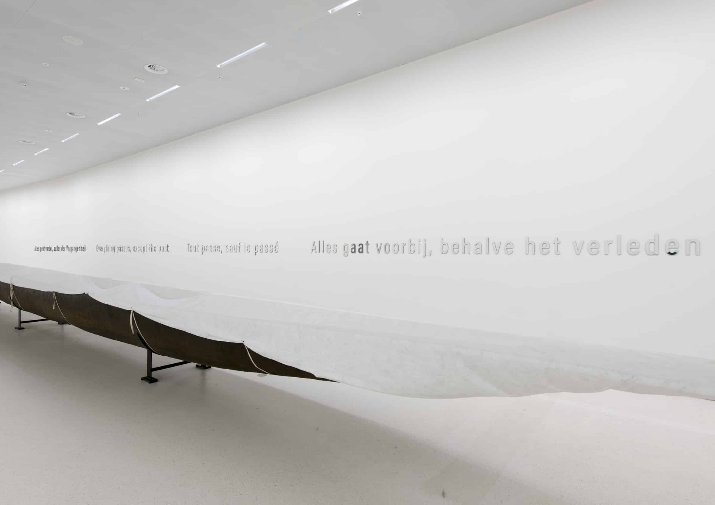 The large canoe in the AfricaMuseum in Tervuren, with the text on the wall in four languages: “Everything passes, except the past.” © Collectie AfricaMuseum