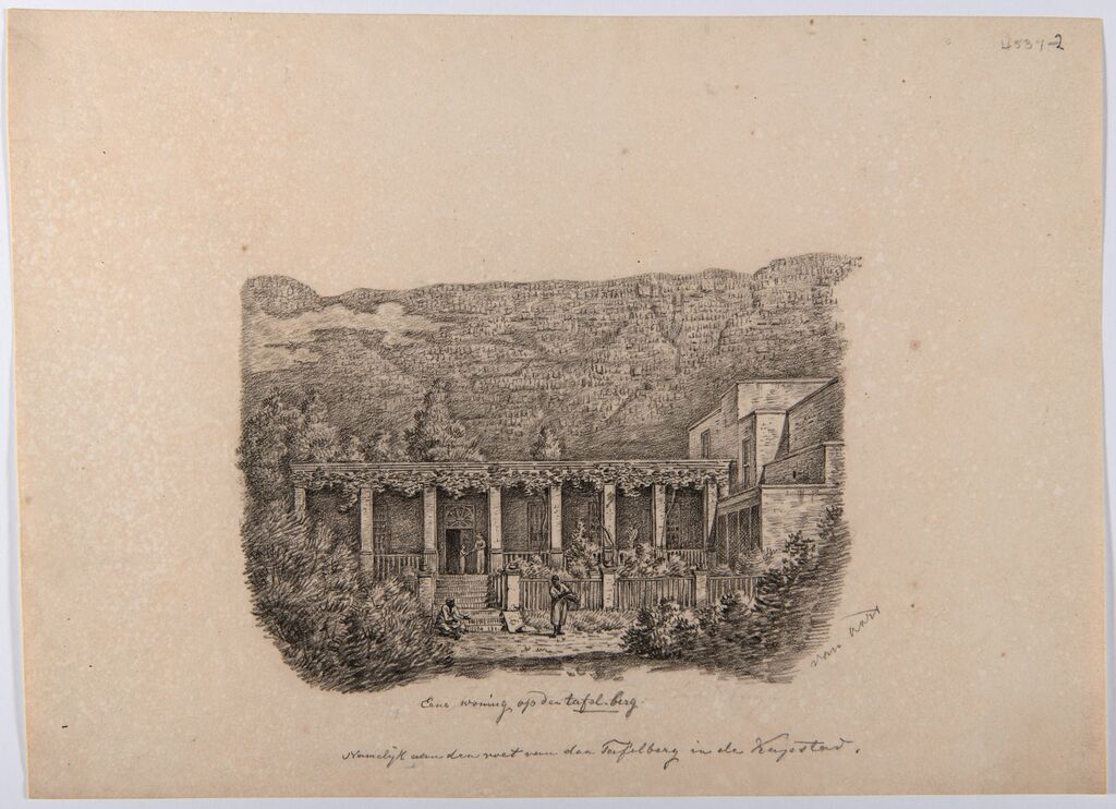 Sketches from 1826 of a colonial mansion in South Africa by the Dutchman Pieter van Oort. The black-and-white sketch shows two South Africans, but in the coloured version they have been omitted. “Symbolic of how these people have been erased from colonial history. We are putting them back into the picture.” © Collection Wereldmuseum, Amsterdam