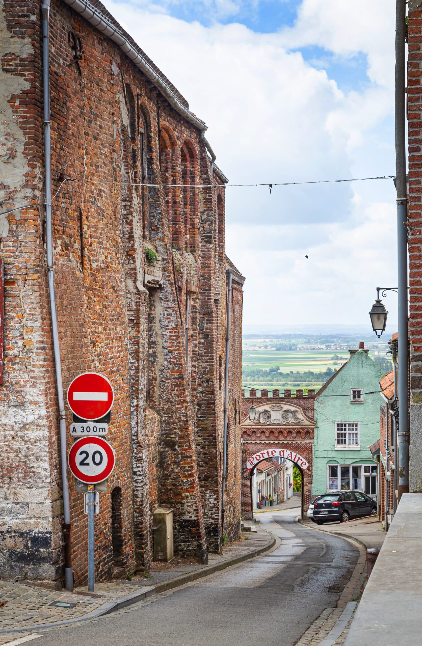 Motorcyclists and bicyclists crowd the cafés: this is the mountaintop of Les Flandres. Before the Romans appeared, Castellum Menapiorum was an oppidum (a fortified area). Caesar made it the capital city of the new Roman Civitas Menaporium. The view over the valley spans 50 kilometres. Seven cobbled, Roman roads fan out in all directions.