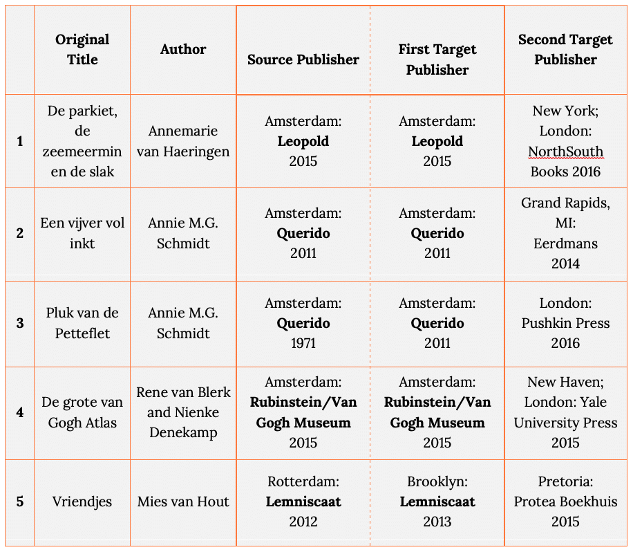 In the Netherlands, Querido, Leopold, and Lemniscaat are the most prolific publishers of Dutch children’s books that appear in English. These three publishers collectively provided 75% of the Dutch source titles that were translated into English by publishers in the Netherlands in the genre of children’s literature in the past ten years. Here, in-house translation reigns: Lemniscaat publishes the vast majority of their own translations in-house through outposts in the United States and United Kingdom, while Querido and Leopold publish in-house English translations at home in the Netherlands, targeting tourists and the ever-growing expatriate and immigrant populations.