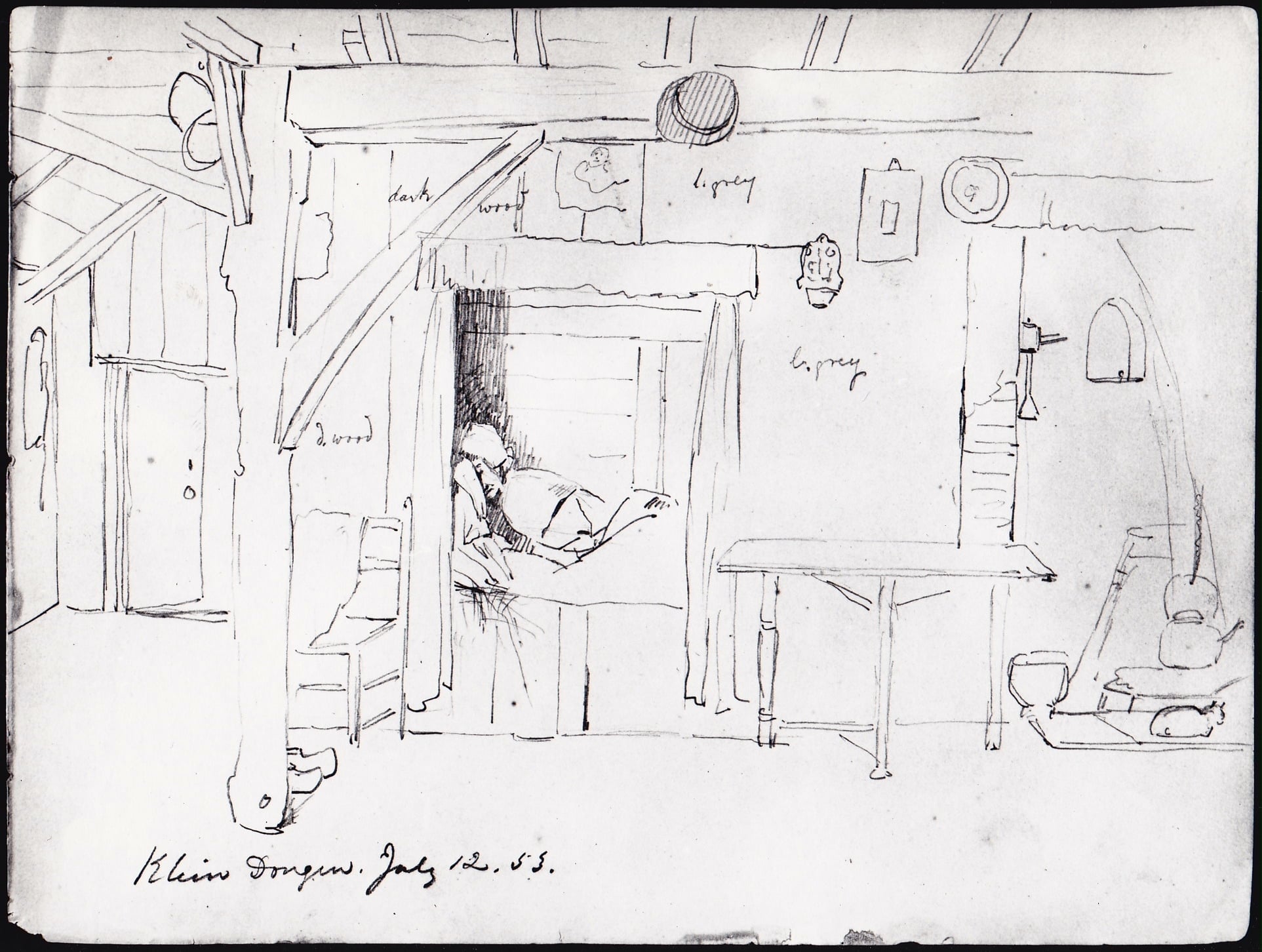 Surrounding areas of The Hague including Scheveningen and Dongen were fertile ground for sketching trips. Always interested in the “picturesque,” Johnson preferred people to landscapes. His Fish woman of Schaveninge [sic] shows his interest in local people and their customs. Interior of a Dutch Farmhouse, with color key, describes an intimate living space.