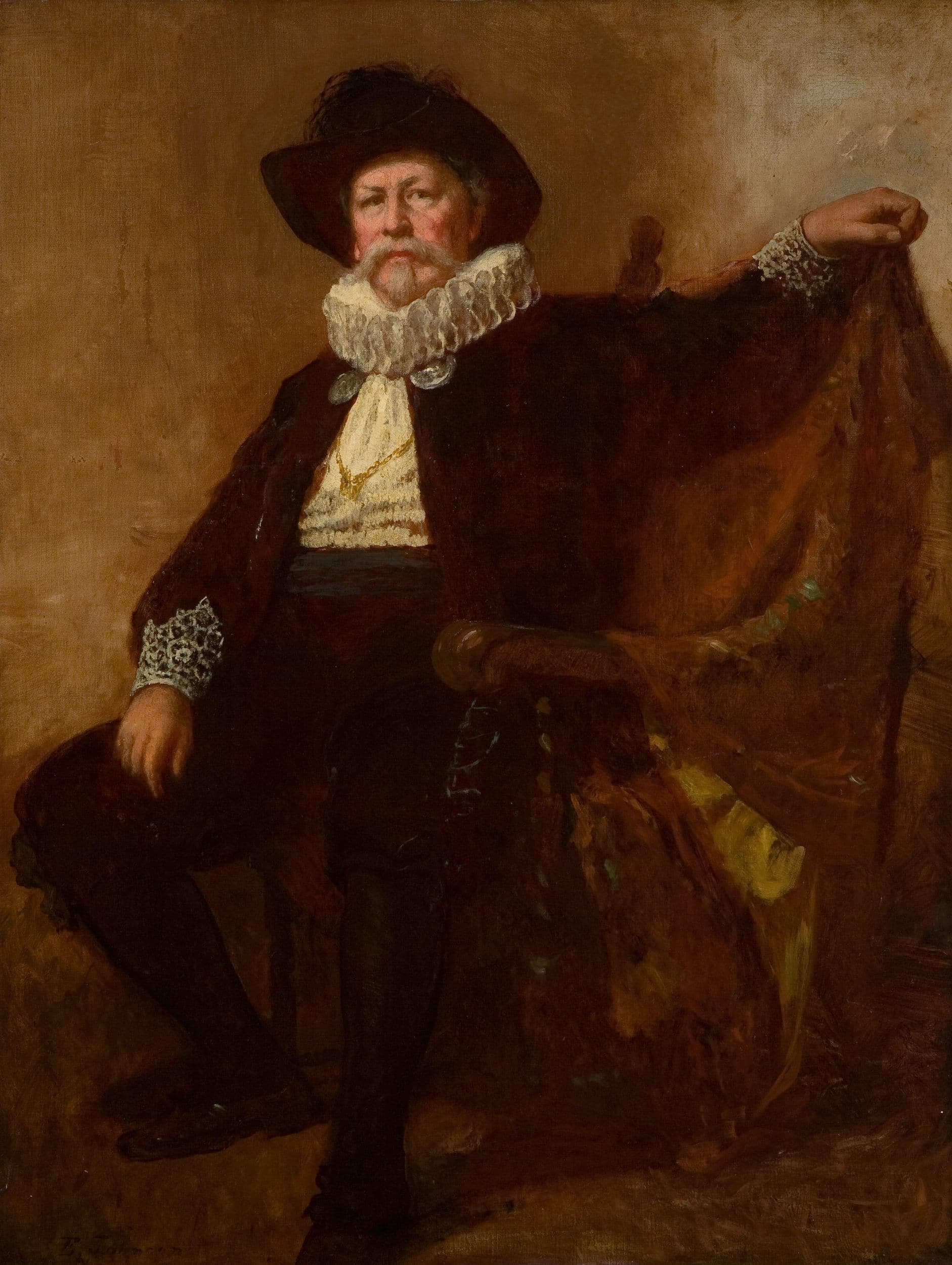 Increasingly in demand for portraits, Johnson made them almost exclusively after 1880, including those of four U.S. presidents. They were generally straightforward depictions, appreciated more for their dignity than psychological insight or technical flair. But he didn’t lose his affinity for Rembrandt. His last self-portrait, c. 1899, is his grandest. Costumed for the Twelfth Night celebration at the Century Association, one of the New York social clubs of which he was a member, the 75-year-old artist poses expansively in an elaborately draped chair. The rich color palette, strong chiaroscuro, and impasto used to describe the ruff at his neck, embroidered cuffs, and his own aging skin and facial hair model dramatically the now well-established artist to whom a younger generation of American artists was compared.