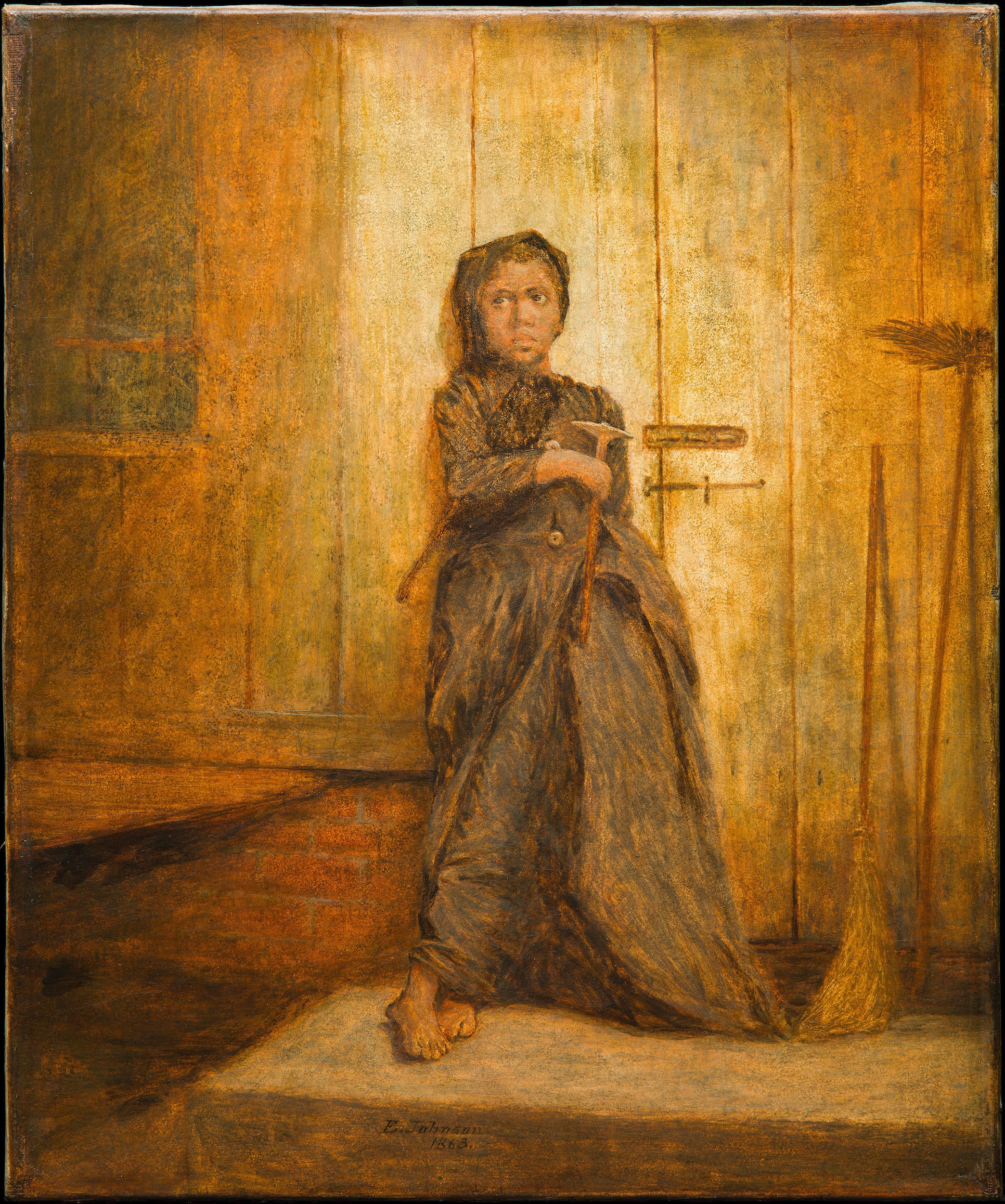 So thoroughly did Johnson apply himself to American people and scenes that he often was praised for being little influenced by European art—yet its influence was plain to see. For example, The Young Sweep, 1863, recalls his European Savoyard of 10 years earlier, the sweeper updated and made more particular as a watchful Black child laborer during the Civil War.