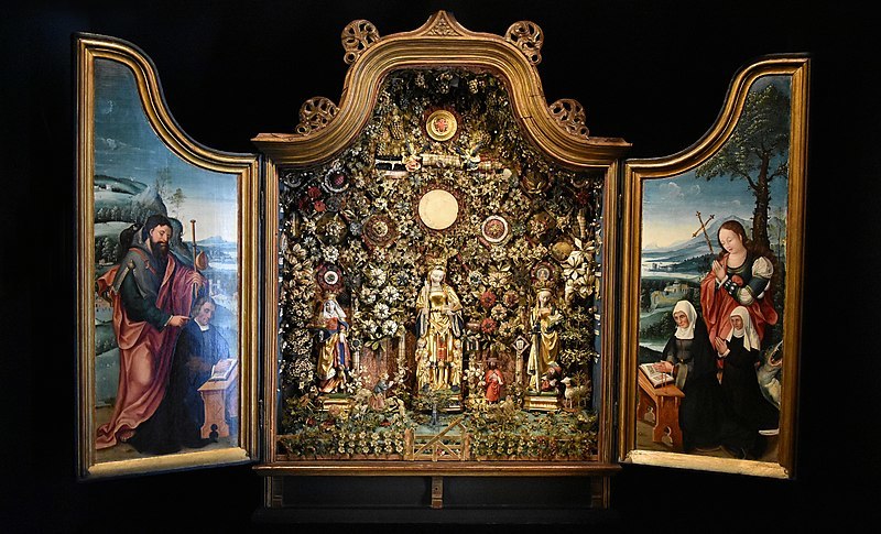 Anonymous, Enclosed Garden with Saints Elisabeth, Ursula and Catharina, ca. 1513, mixed media, including wood, oil paint, textile and wax, 188.5 x 134 cm, Museum Hof van Busleyden, Mechelen© Museum Hof van Busleyden, Mechelen