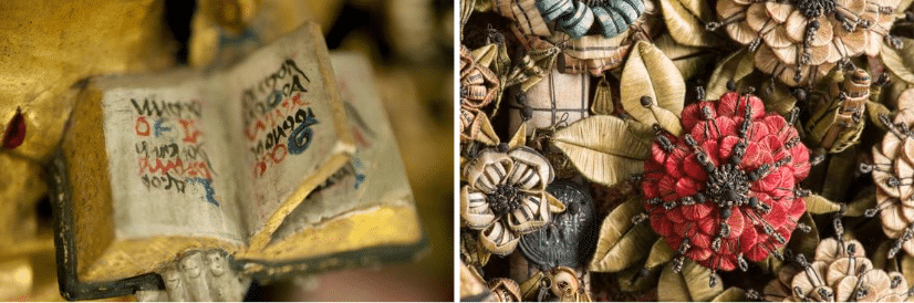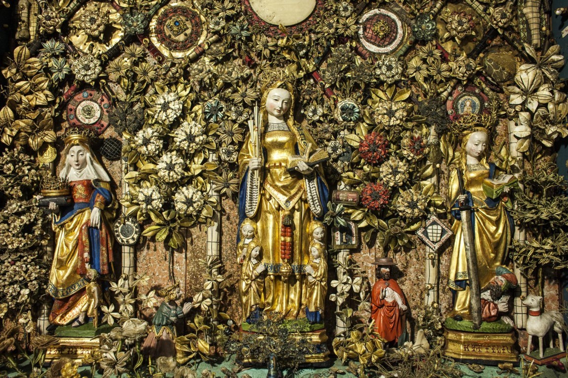 The iconography is quite complex, and perfectly suited to the hospice nuns. Three female saints stand in a hortus conclusus, the Latin term for an enclosed garden. The various references to one of the most mystical texts in the Bible, the Song of Songs, the stories of martyrs, and references to piety and purity fit perfectly with the spiritual world of the Augustinian nuns. A hybrid and overwhelming spectacle of images, relics, textiles, flowers and other objects enhances the religious experience.