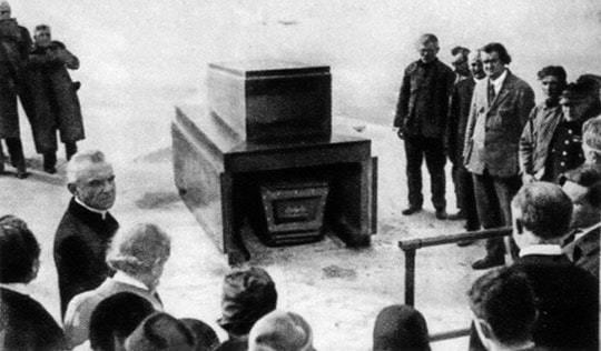 Photograph form 1927 showing the removal of Verhaeren's remains from Wulveringem near Veurne to be taken and reburied in his home village, on the banks of the Scheldt, as he had requested.© Wikimedia Commons