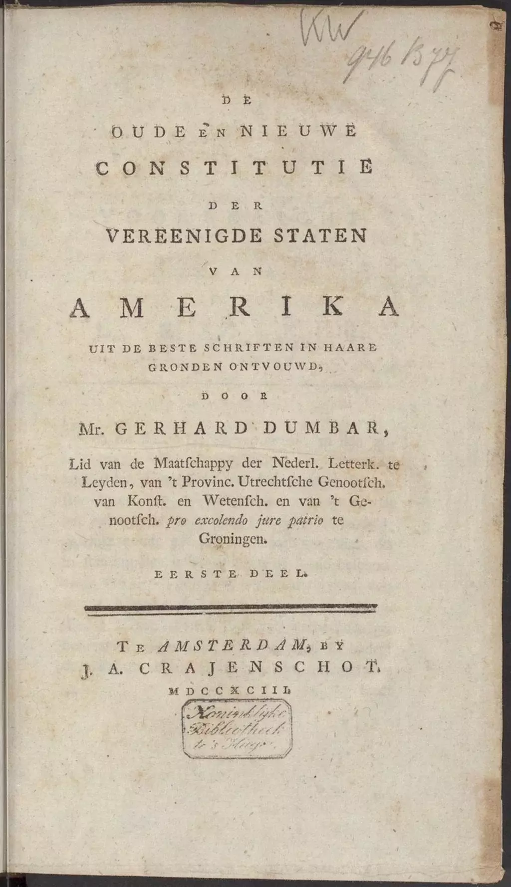 Title page of Dumbar’s book on the American Constitution, 1793© National Library of the Netherlands