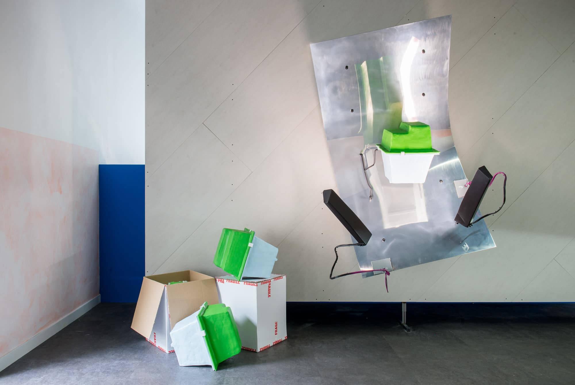 Free-standing sculpture is by definition a medium that bends a space to its will. This has led to cross-pollination between sculpture and installation art among various artists, and this has also been the case for Bauer. With his first substantial solo exhibition, Vormaliteit (English: Formality) (April-July 2018, Concordia, Enschede), he created a large installation, in which many of the images were presented on the same kind of pedestal. In true Bauer-style, he was inspired by the round platforms found in showrooms. His compositions were positioned on these platforms as if they were washing machines or cars, presented as attractively as possible to lure consumers.