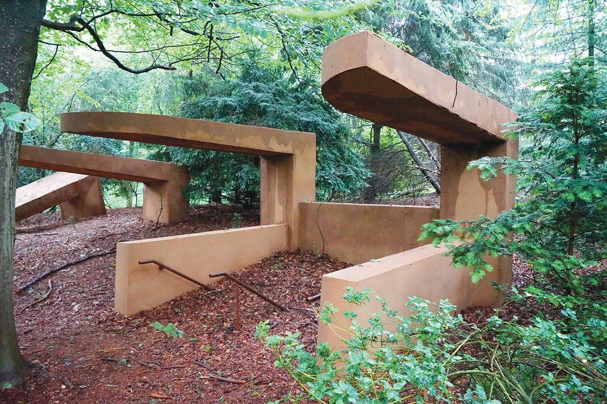 Between the trees, he created forms that are difficult to define, but at the same time directly connect you with the concrete and the visual language of urban architecture. The project was even announced using the kind of billboards you see on new construction projects, which give a visual impression of what will be built in that location. Bauer has also positioned handrails next to his architectural elements, and some of these also stand alone in the woods – an obvious reference to an entrance, but one that ultimately leads nowhere. The actual city thus always remains out of reach; modernity has half sunk into nature as if nature has been winning the race for quite some time. The shapes are unmistakable, but the function has become a ghost that doesn’t leave you alone.
