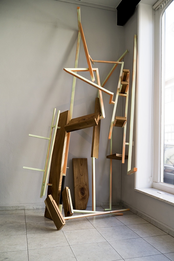 Bauer’s sculptures around that time were often based on geometric shapes. But in 2011, he was struggling with one particular work – a large, rectangular object. Out of frustration, he decided to cut it in half. The floorboards became a geometric cloud-like construction and above that, he placed a diagonal door, in which he had made a hole so that one could see through the entire work of art. This struck him. Deconstruction turned out to be a fresh impulse in his art: with a few interventions, he could inactivate familiar impressions.