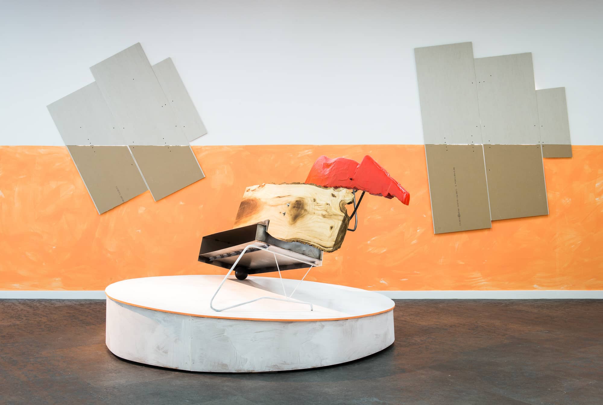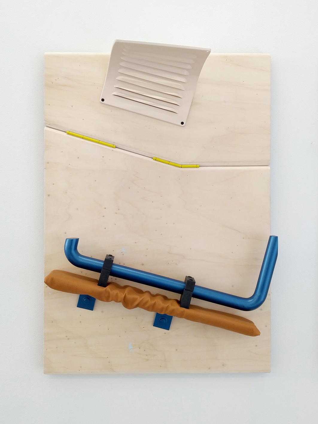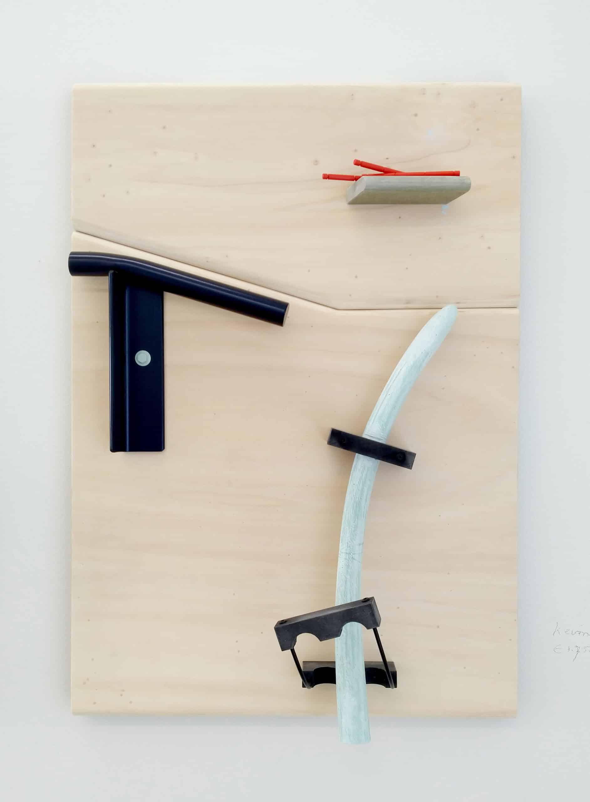 He also began to use found objects more and more – such as part of his bed. He positioned these objects within his compositions in a way that betrays the influence of painting by the relationship between the shapes as well as the colours of the individual parts. His most recent ‘wall works’, such as Practicularity and Never a Dull Moment (2021), resemble paintings made of materials such as plywood, leatherette and putty. The shapes are partly detached from the background, which in itself also demands attention. In a ‘normal’ painting, the wood would have been completely painted. Here though, we look at transparent lacquered sheets that seem to have walked out of a hardware store.