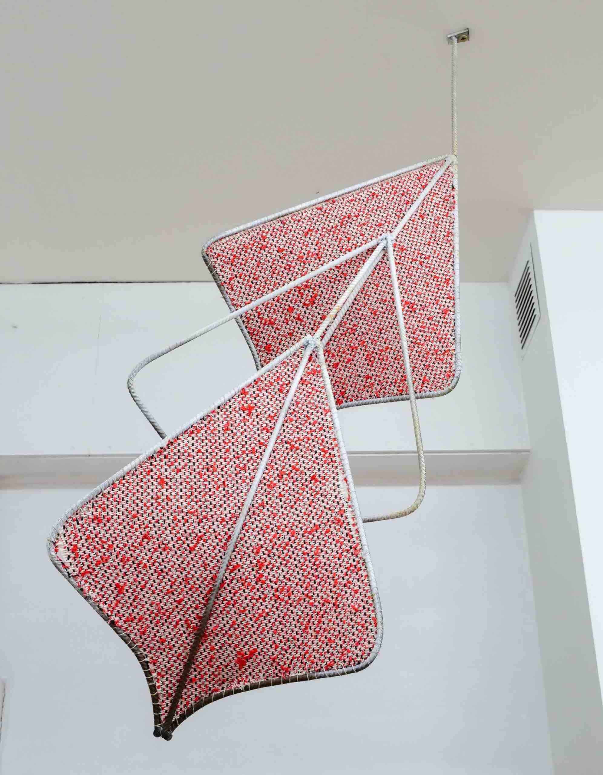 Textiles proved to be ideal, also for creating the large volumes that she is so interested in. ‘I once used a cloth as an unstretched canvas, but it accidentally folded. Since then, I have often made sculptures with a curved, soldered or woven frame over which I stretch fabrics. Because textile bends in different dimensions, it works well with other materials and its softness provides contrast against harder textures like steel, plastic, wood…’