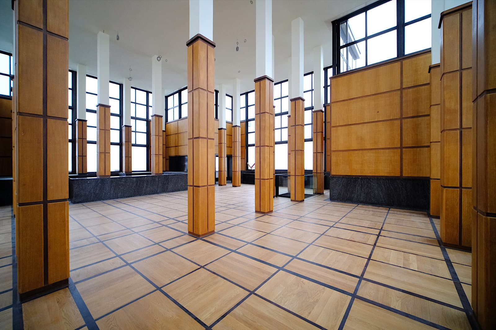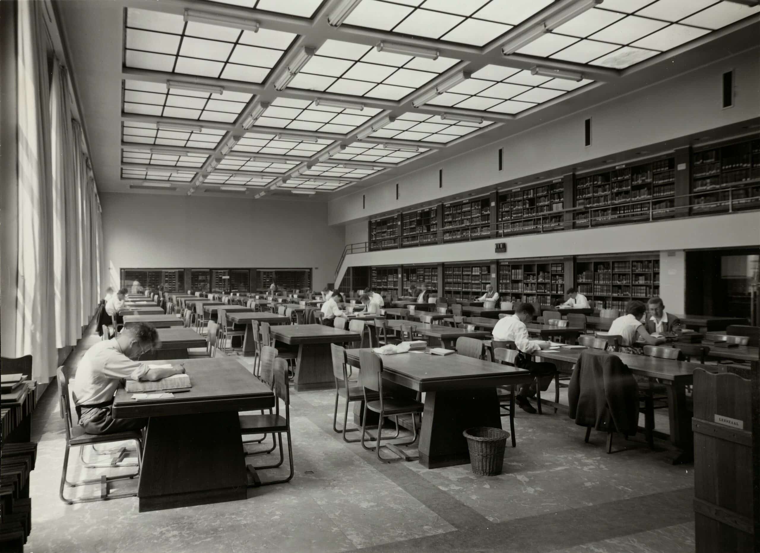 Yet another historic moment followed a decade later – the decision was taken to celebrate the recent Dutchification of the university with a new library building. Director August Vermeylen (1872 – 1945) passed this honourable task to his childhood friend Henry Van de Velde, who developed a plan for a tower that he himself described as “a mighty bookcase reaching to the skies”. The foundation was laid in 1936, and the new library opened its doors in 1942. Collections were relocated from their wartime home on the Ottogracht, where the city library remained, but upon its opening, the Book Tower was by no means the Gesamtkunstwerk that Van de Velde had envisaged – certainly not as far as the interior was concerned. The completion of the building would drag on until 1960, three years after his death.