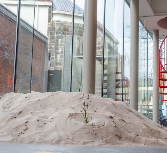 It was impossible to overlook one work in particular. Oo𝑜օₒ (2021) consisted, among other things, of a large mound of sand, containing tufts of marram grass. With the speed of a clock, these wrote O’s around their own axis, “driven” by visitors passing by. The work looked like a kind of dune pushed up against a glass wall. Outside you could see people walking along the street.