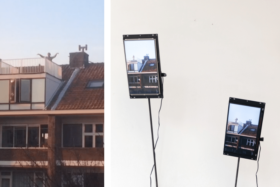 Following on from her performances, she also started to produce videos. She rarely presents these as independent work, and rather shows them within a spatial context. An example of this is Flying Neighbor (2018), in which a man on a roof is making ominous arm movements. Will he really do it? This impression shifts when he then lifts a baby up. Onis considers the scene a lucky find that she gratefully uses. The graininess of her phone camera also gives the scene something fleeting and sketchy.