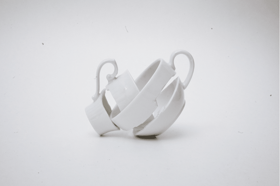 The two porcelain cups are incomplete – large parts have been removed, leaving only half of each object. It’s only then that it becomes clear that these pieces are joined together by the cup’s handle. The cups are archetypically white, but they have lost their most important function – you can no longer drink from them. As if that wasn’t enough visual confusion, both cups seem to be leaning on each other.