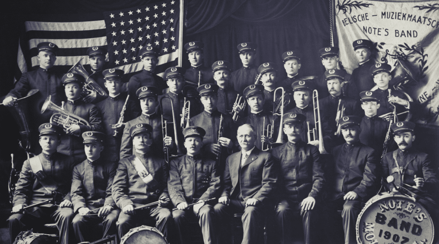 Note’s Band, the Flemish-American music association of Moline in 1918. Many Flemish immigrants worked at the John Deere tractor factory © Center for Belgian Culture, Moline