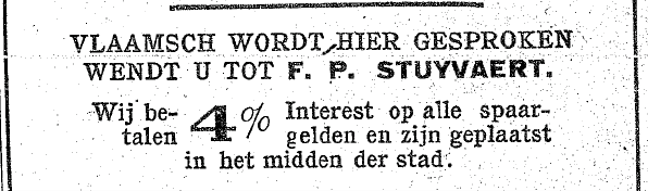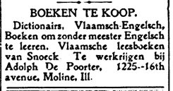 Advertisements such as this one, published in De Gazette of Moline (1910) and De Volksstem (1911), commonly included the phrase ‘Hier spreekt men Vlaamsch’© De Gazette van Moline / De Volksstem