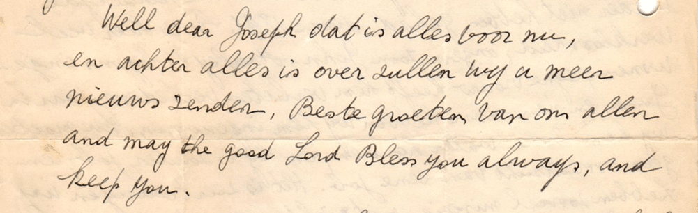 As the title of my second study suggested (From ‟dankgevingsdag” to ‘turkey party”), English words turned up in many different ways in the language of early Flemish Americans. Sometimes these words were given inventive translations, such as drijver for driver or trafieklaan for traffic lane. Other times, English and Dutch were combined into hybrid words, such as farmgerief (farm equipment) or haardresser (hairdresser). Every so often, full English expressions were included, as in a 1950 letter from W. and S., ending with: “Beste groeten van ons allen (best regards from all of us) and may the Lord bless you always, and keep you.”