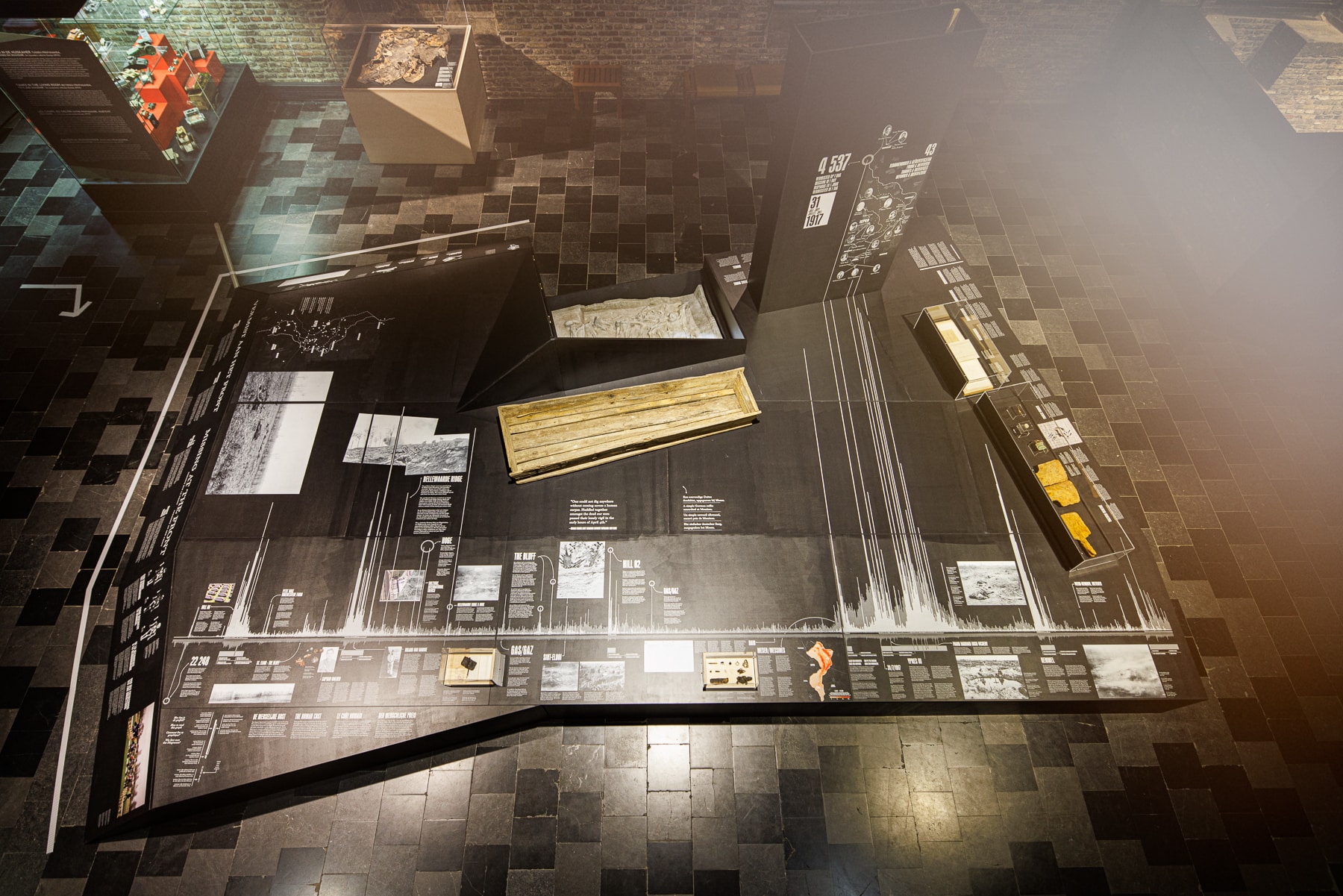 The exhibition looks back on more than twenty years of archaeological research. Maps and aerial photographs provide an overview of the places where human remains were found, while Archaeological photos and a scale model show the condition in which they came to light a century after the war. In addition, a timeline, unique historical images and military maps and drawings take you back to the lines, the trenches and the bomb craters where the soldiers lost their lives.