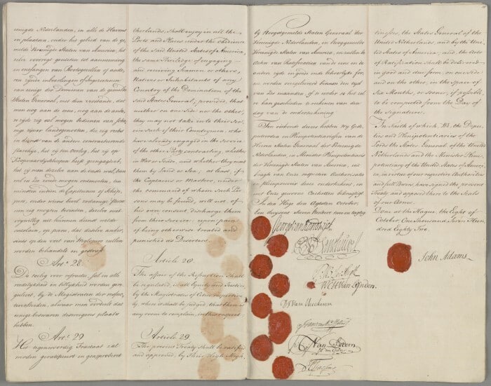 Following the acceptance of his credentials, John Adams informed the States General that he had been instructed to negotiate a treaty of friendship and trade between the United States and the Dutch Republic. The treaty was signed on 8 October 1782.© National Archives of the Netherlands