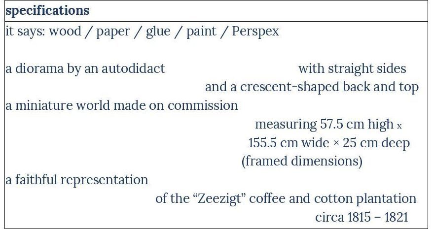 Eighteen young authors have brought nineteenth-century artefacts from the Rijksmuseum to life. They have taken inspiration from the question: what do you see when you look at these objects with an eye for invisible labour? Laure-Anne Vermaercke invites us to take a very close look at the Diorama of the Zeezigt Coffee and Cotton Plantation, made by Gerrit Schouten in c. 1815 – c. 1821. ‘A miniature world made on commission.’