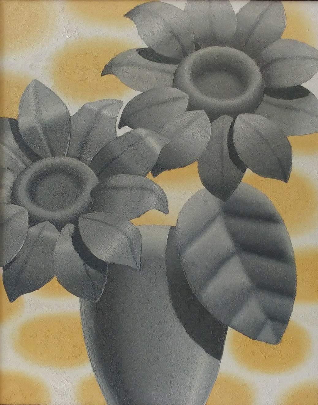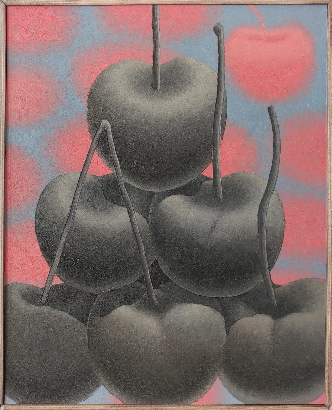 has grey sunflowers in a vase backed by smudges of yellow. A Statue for Guston has grey cherries in the foreground, with a wallpaper of pink cherries behind.
