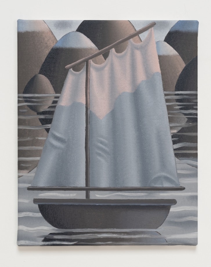 Seen together, there is also an ambiguous sense of scale in Legiers’ paintings. The rocks beneath the water and the distant hills have the same ovoid form, so you start to wonder if you are looking at a real sailing boat, or toys in a pond. And some of the ovoids could simply be eggs. Perhaps these are all still lives rather than landscapes after all.