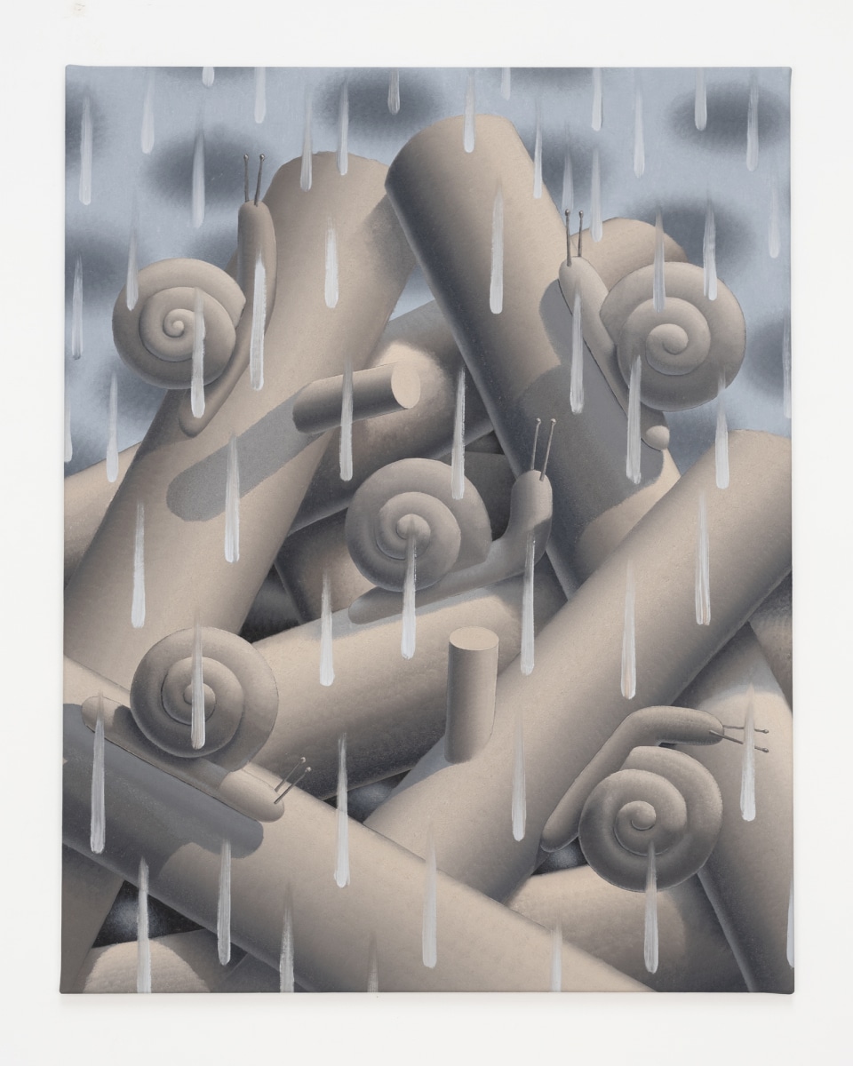 In Legiers’ subsequent work, the combination of forms becomes more complex and the layers multiply. Raindrops now cascade across the face of his paintings, as in Struggling in Bad Weather, the drops forming a curtain in front of snails scaling fallen branches. His raindrops are no less stylised than the rest of his forms, yet here (and in the ripples on water) there is a chance to see the thickness in the paint and a hint of the artist’s hand.