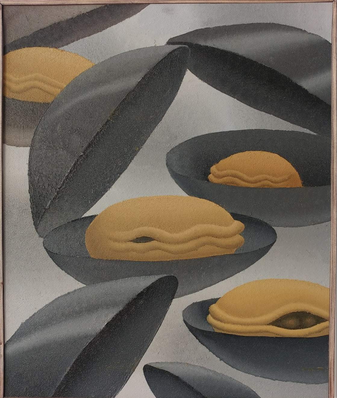 The style that Legiers developed in these paintings shares Magritte’s interest in ideal forms: the apple that stands for all apples, the man in a bowler hat who stands for humanity, the leaf that stands for the whole tree. Looking for a Belgian theme, Legiers chose – rather predictably – the mussel, which he paints fleshy and thick-lipped, sitting on a too-perfectly smooth shell. The detail, even the natural texture, is stripped away, reducing the mussel to an ideal form. A similar treatment makes motifs of lobsters, starfish and shrimp.
