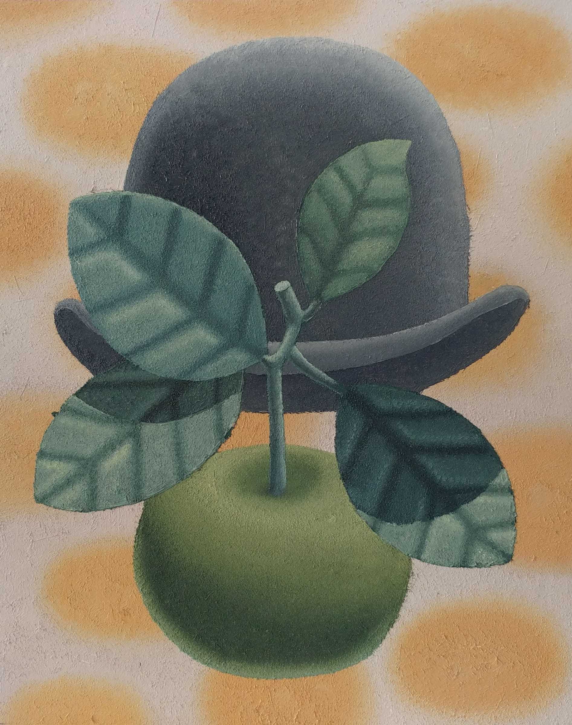 These are thematic tributes rather than expressions of a debt of style. Nothing could be further from Van Gogh’s fiery flowers or Philip Guston’s cartoonish Cherries. But Ode aan Magritte (Tribute to Magritte) is closer to home, combining a bowler hat, an apple, and the kind of stylised leaves that recur in Magritte’s paintings. A further surrealist echo, this time with Dali, comes through with Legiers’ obsession with snails, which sometimes appear as background, sometimes as the main subject.