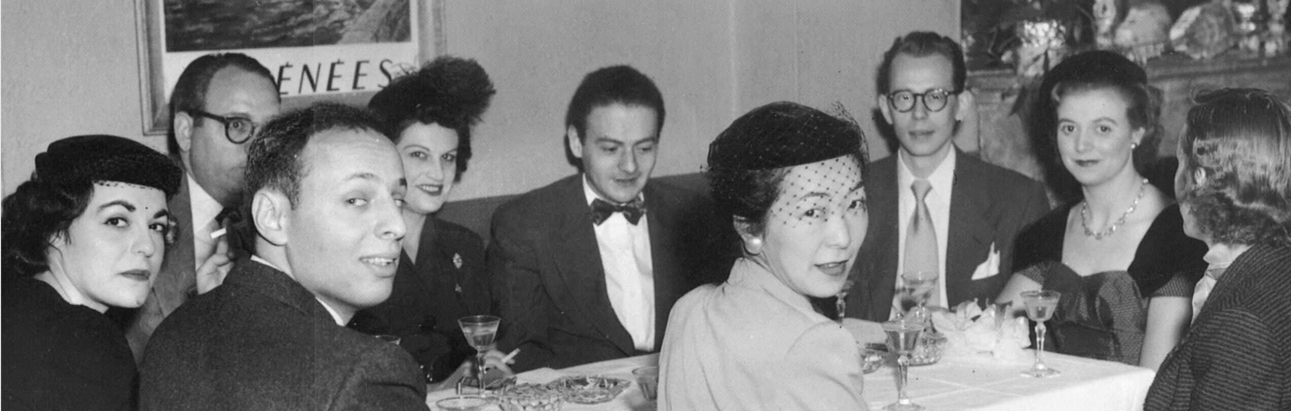 In the back row, from right to left: Francine De Bevere and Morris, René Goscinny (with bow tie) and, in the foreground, Harvey Kurtzman in New York, circa 1951© Lucky Comics, 2023