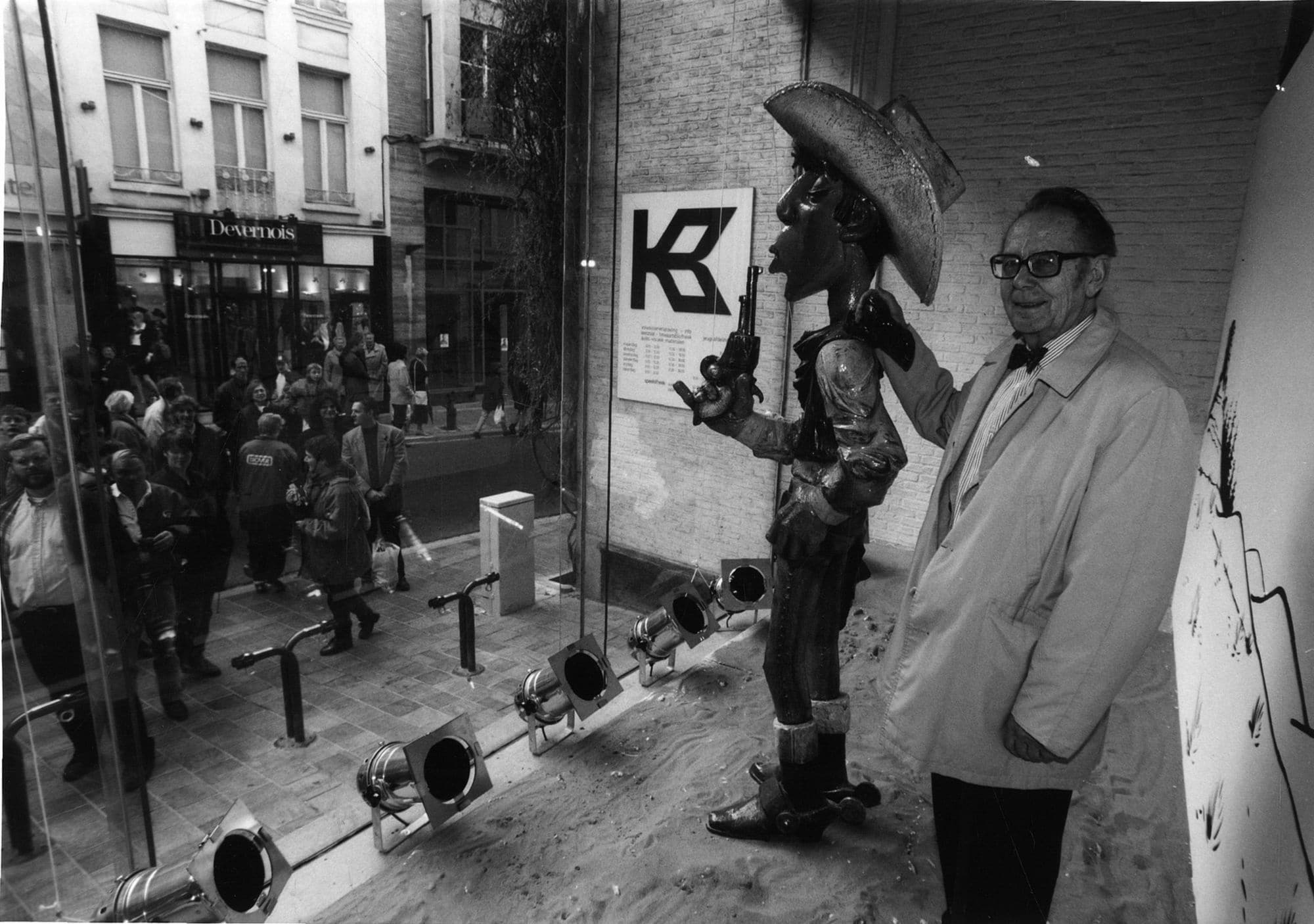 Morris next to the statue of Lucky Luke in the library of Kortrijk, the cartoonist's hometown, in 1997.© City of Kortrijk
